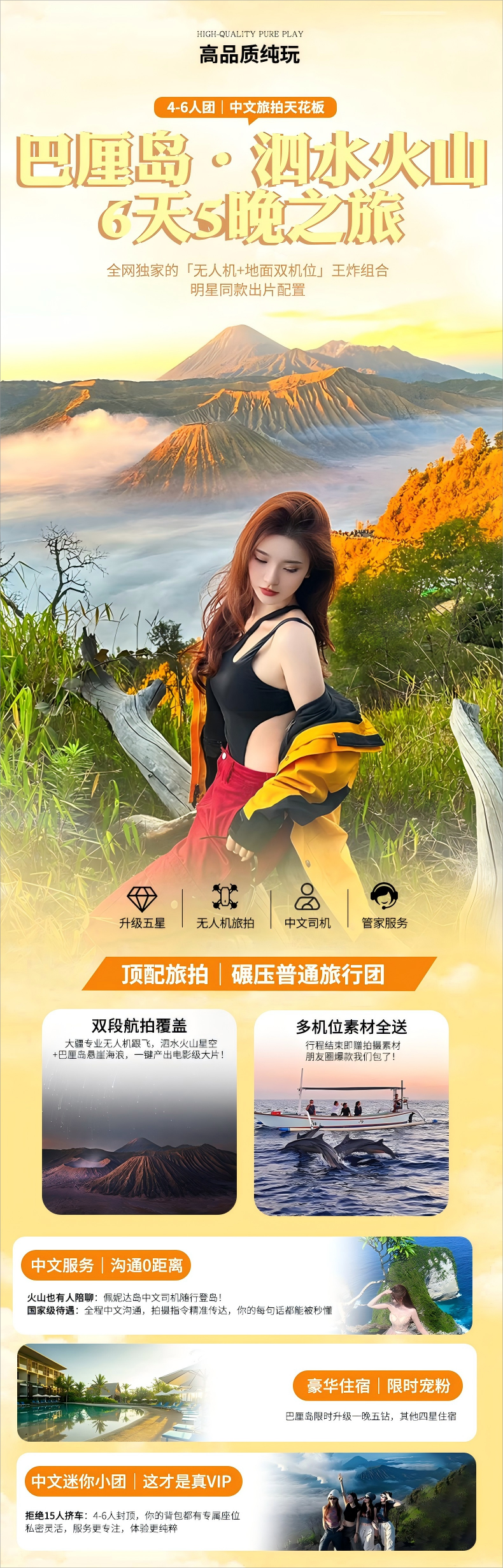 无人机固定拍摄4个机位: 赛武瀑布sewu(观景台) 布罗莫火山bromo(沙海) 乌布梯田俱乐部 精灵坠崖kelingling beach (不包含ijen景区,为景区禁飞无人机, 而且ijen是景区向导带队,司机需要睡觉 不去爬山,无法拍摄)
